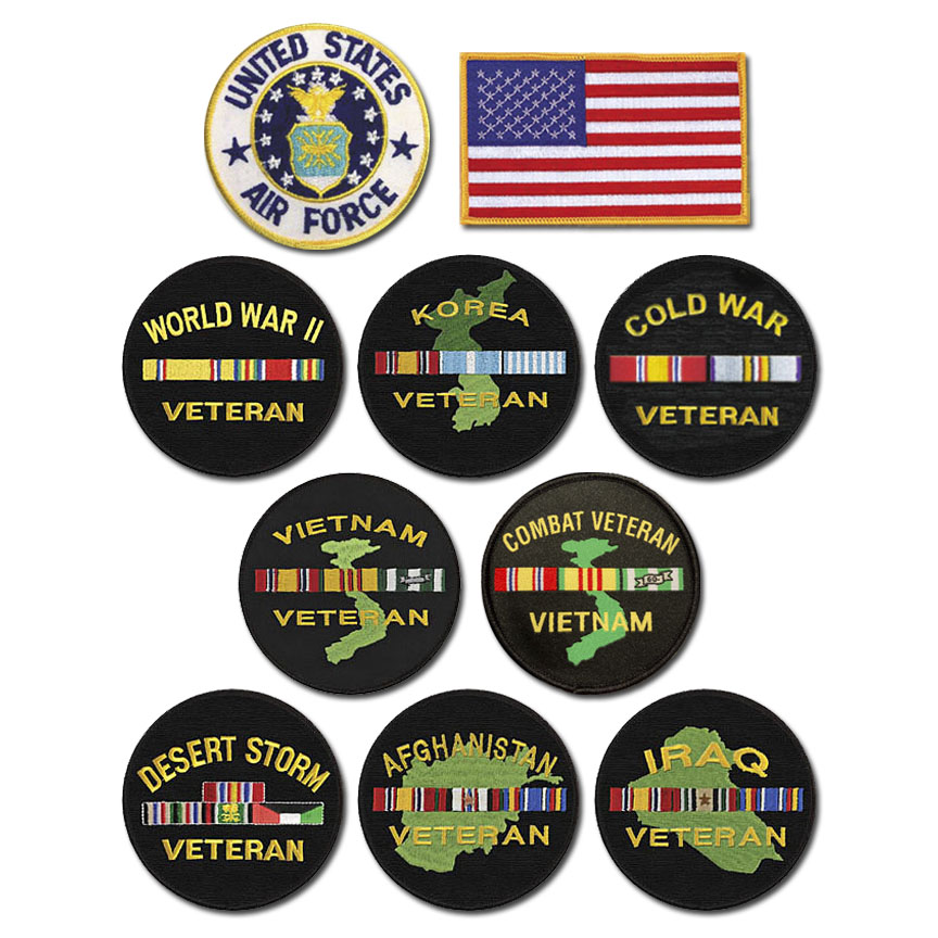 Add a Air Force Service* Branch, American Flag and/or War Veteran Iron-On Patch of your choice for just $10 with purchase. Choose from: Air Force, American Flag, WWII Veteran, Korea Veteran, Cold War Veteran, Vietnam Veteran, Combat Veteran Vietnam, Desert Storm Veteran, Afghanistan Veteran and Iraq Veteran. (see right)